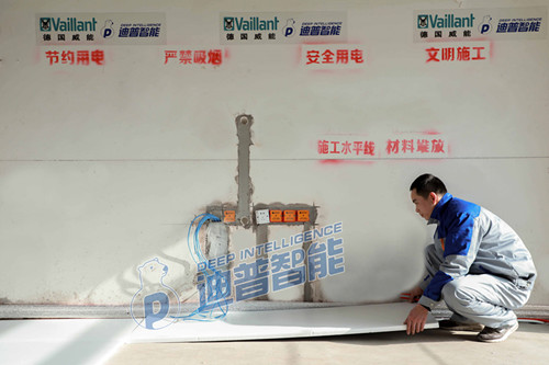第六步:接分水器。我們用的分水器是威能進口的VaiM地板采暖分集水器。VaiM系列集分水器針對地板輻射采暖系統(tǒng)設(shè)計,主管黃銅熱壓一體鍛造成型,最大程度保證了強度的同時,也最大程度的降低了漏水的可能性。內(nèi)部結(jié)構(gòu)設(shè)計合理,優(yōu)化各支路的流量平衡,從而可以更好的控制地板輻射采暖系統(tǒng)的熱量,降低系統(tǒng)水流阻力。